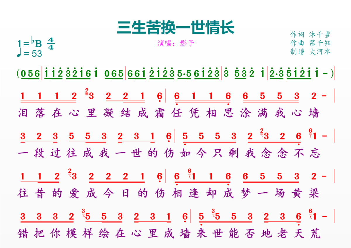 《三生苦换一世情长》是影子演唱的一首歌曲,拍号为4/4拍,歌曲速度为每分钟53拍,这份简谱共有一张高清图谱,图谱由 @临海雪原 编配上传。