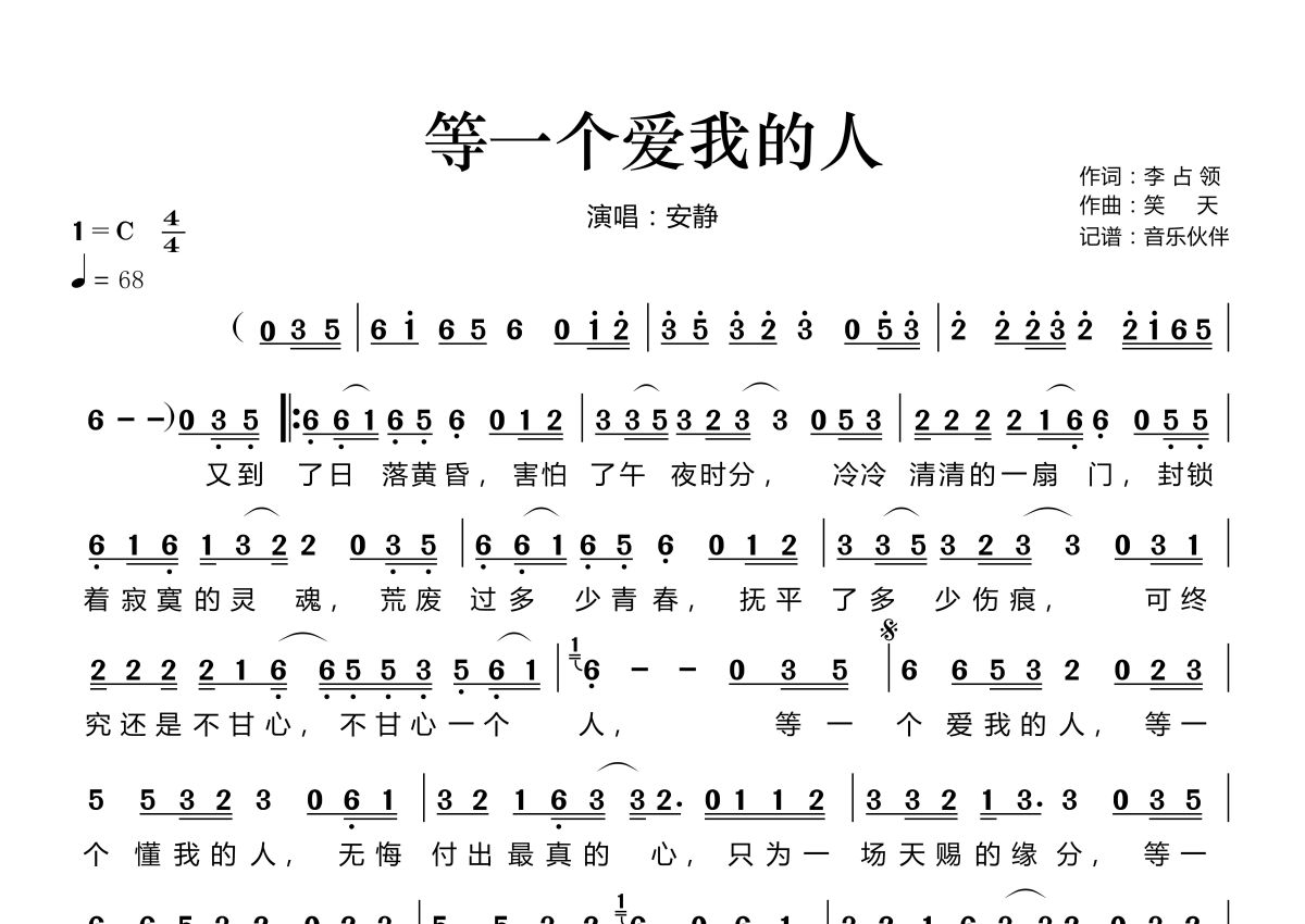 《等一个爱我的人》是安静演唱的一首歌曲,拍号为4/4拍,歌曲速度为每分钟68拍,这份简谱共有一张高清图谱,图谱由 @音乐伙伴 编配上传。
