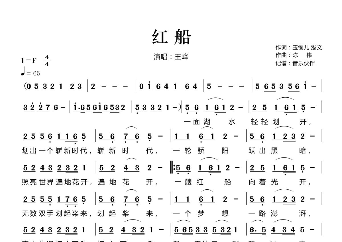 《红船》是王峰演唱的一首歌曲,拍号为4/4拍,歌曲速度为每分钟65拍,这份简谱共有一张高清图谱,图谱由 @音乐伙伴 编配上传。