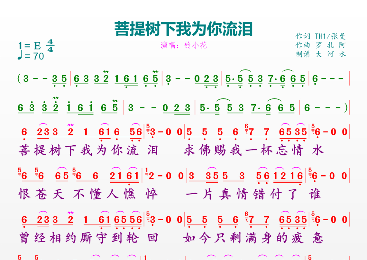 《菩提树下我为你流泪》是铃小花演唱的一首歌曲,拍号为4/4拍,歌曲速度为每分钟70拍,这份简谱共有一张高清图谱,图谱由 @临海雪原 编配上传。