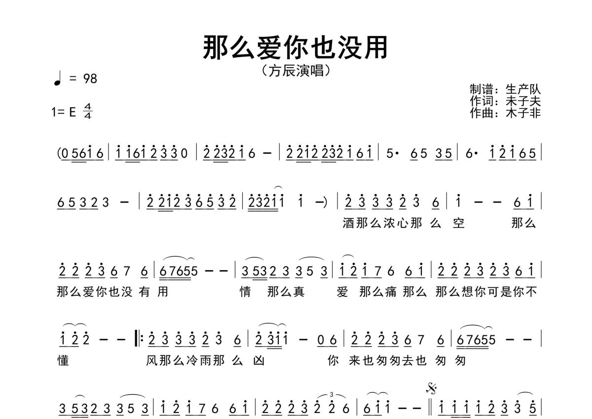 《那么爱你也没用》是方辰演唱的一首歌曲,原版简谱,拍号为4/4拍,歌曲速度为每分钟98拍,这份简谱共有一张高清图谱,图谱由 @生产队 编配上传方辰演唱的歌曲《那么爱你也没用》原版简谱,含精准的前奏、间奏、尾奏solo编配,精编完美版,优质推荐!。