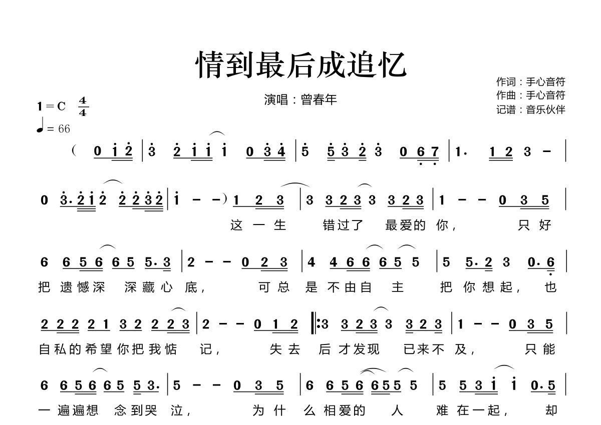 《情到最后成追忆》是曾春年演唱的一首歌曲,拍号为4/4拍,歌曲速度为每分钟66拍,这份简谱共有一张高清图谱,图谱由 @音乐伙伴 编配上传。