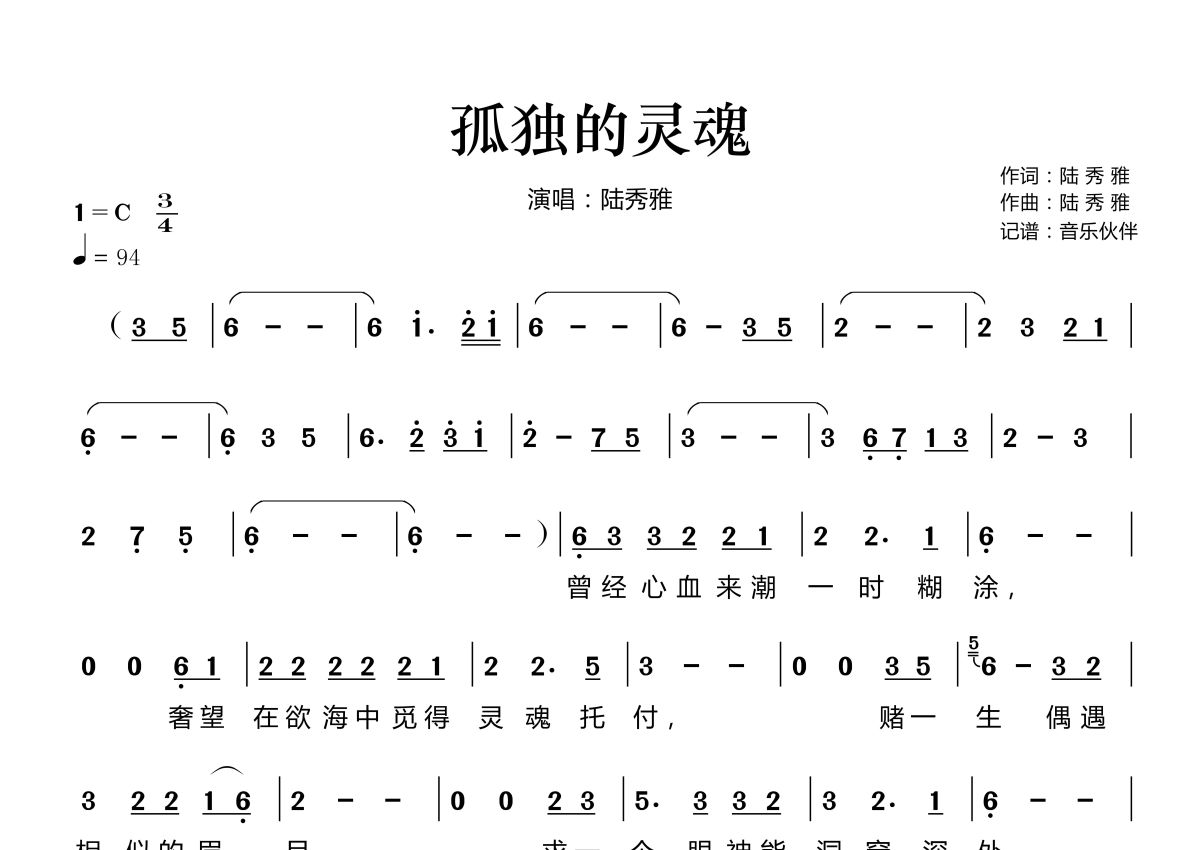 《孤独的灵魂》是陆秀雅演唱的一首歌曲,拍号为3/4拍,歌曲速度为每分钟94拍,这份简谱共有两张高清图谱,图谱由 @音乐伙伴 编配上传。