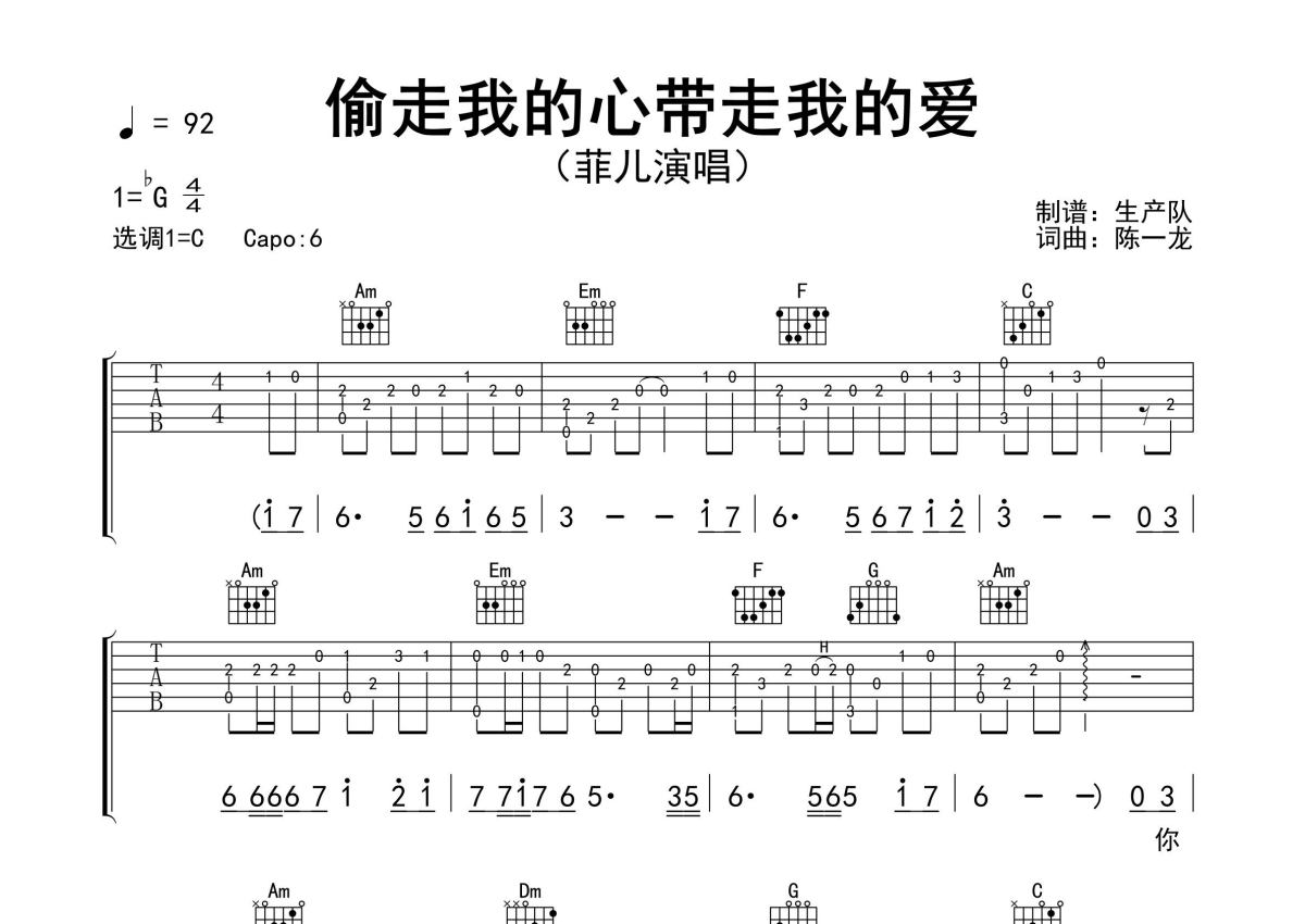《偷走我的心带走我的爱》是菲儿演唱的一首歌曲,精编完美版,拍号为4/4拍,歌曲速度为每分钟92拍,歌曲原调为Gb调,但由于原调指法比较难,为了方便弹奏,本吉他谱采用的是C调指法编配,变调夹6品弹奏即为原调,当然也可以根据自己的音域改变变调夹位置,或者通过改变和弦调性,以方便自己弹奏,这份吉他谱共有两张高清图谱,图谱由 @生产队 编配上传,图谱使用六线谱编配,包含吉他和弦指法、简谱以及歌词部分,使用这份偷走我的心带走我的爱吉他谱,可以让你更加方便地掌握这首歌曲的弹唱技巧,快来尝试吧。菲儿演唱的歌曲《偷走我的心带走我的爱》原版吉他谱,含精准的前奏、间奏、尾奏solo编配,精编完美版,优质推荐!。