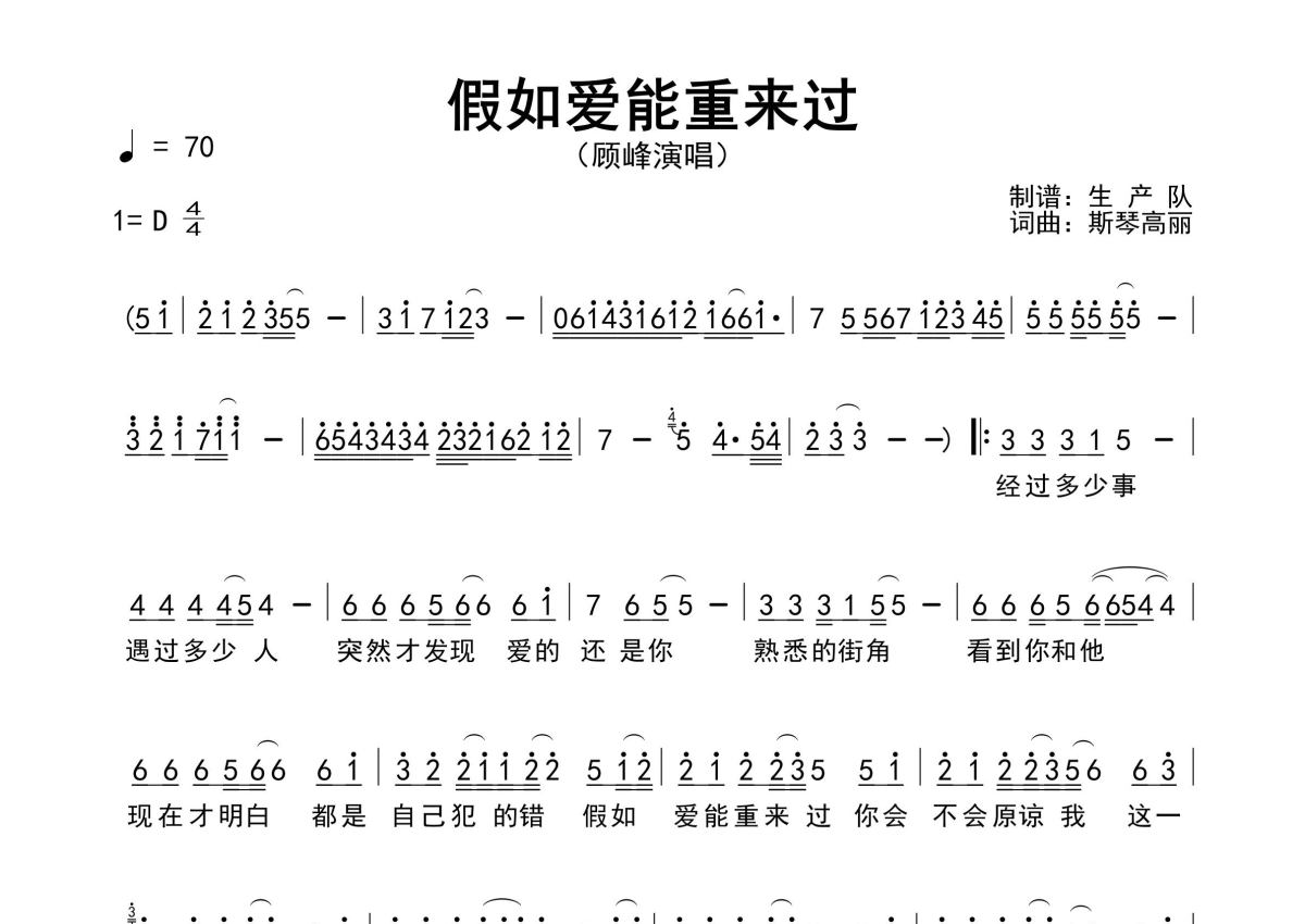 《假如爱能重来过》是顾峰演唱的一首歌曲,原版简谱,拍号为4/4拍,歌曲速度为每分钟70拍,这份简谱共有一张高清图谱,图谱由 @生产队 编配上传顾峰演唱的歌曲《假如爱能重来过》原版简谱,含精准的前奏、间奏solo编配,精编完美版,优质推荐!。