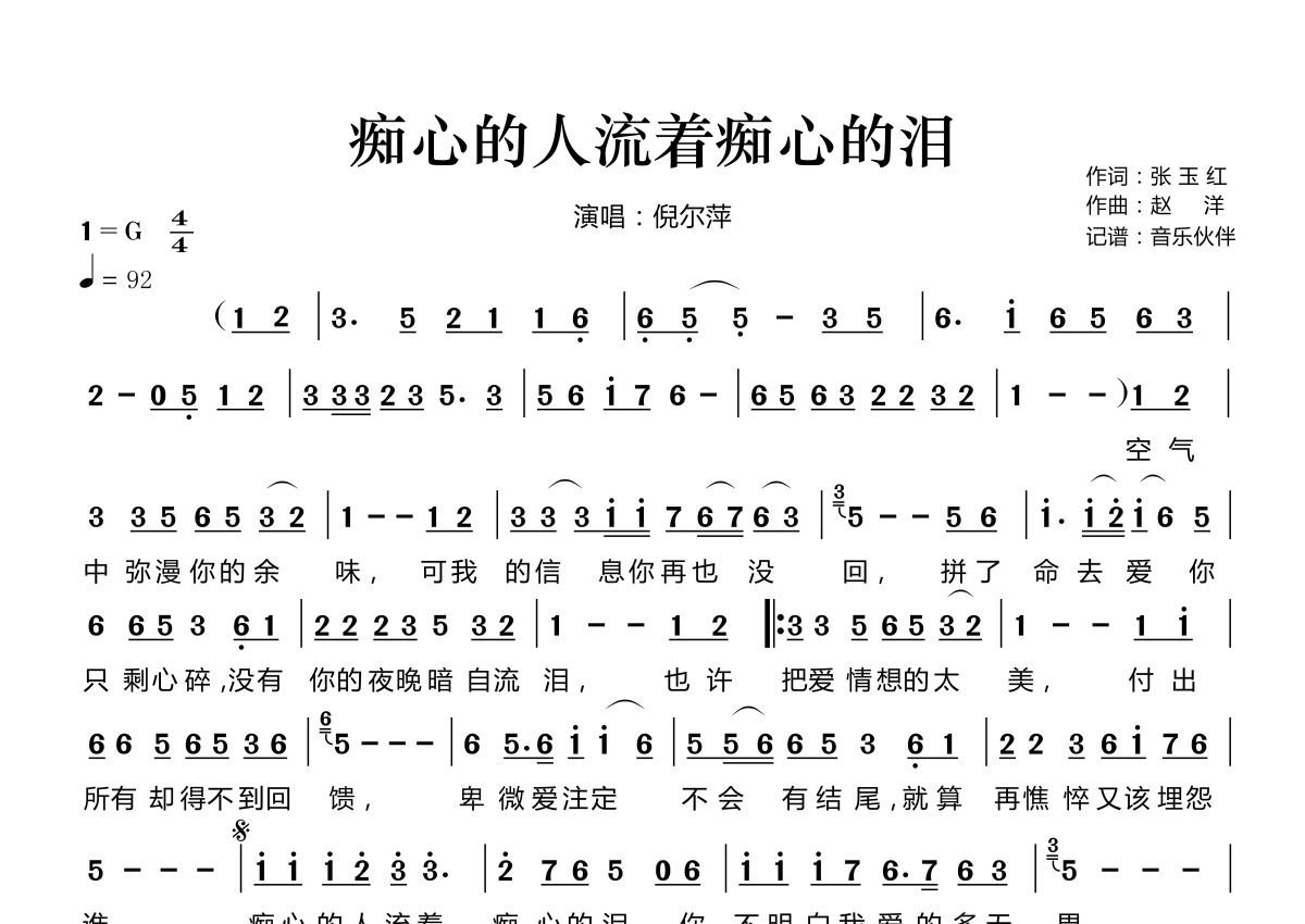 《痴心的人流着痴心的泪》是倪尔萍演唱的一首歌曲,拍号为4/4拍,歌曲速度为每分钟92拍,这份简谱共有一张高清图谱,图谱由 @音乐伙伴 编配上传。
