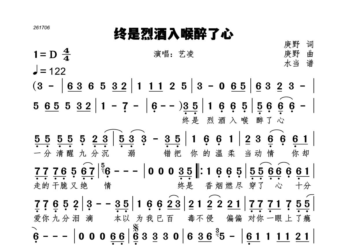 《终是烈酒入喉醉了心》是艺凌演唱的一首歌曲,拍号为4/4拍,歌曲速度为每分钟122拍,这份简谱共有一张高清图谱,图谱由 @水当 编配上传。