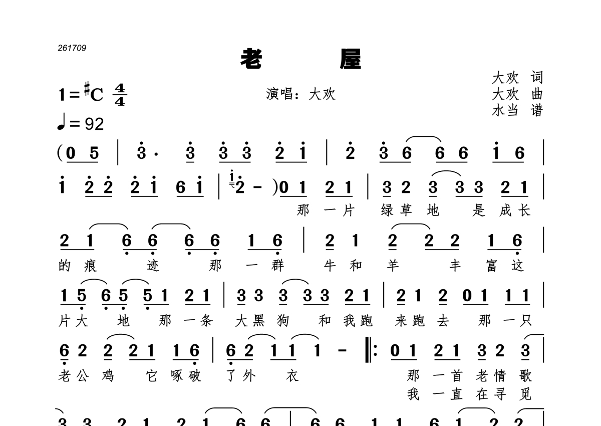 《老屋》是大欢演唱的一首歌曲,拍号为4/4拍,歌曲速度为每分钟92拍,这份简谱共有两张高清图谱,图谱由 @水当 编配上传。
