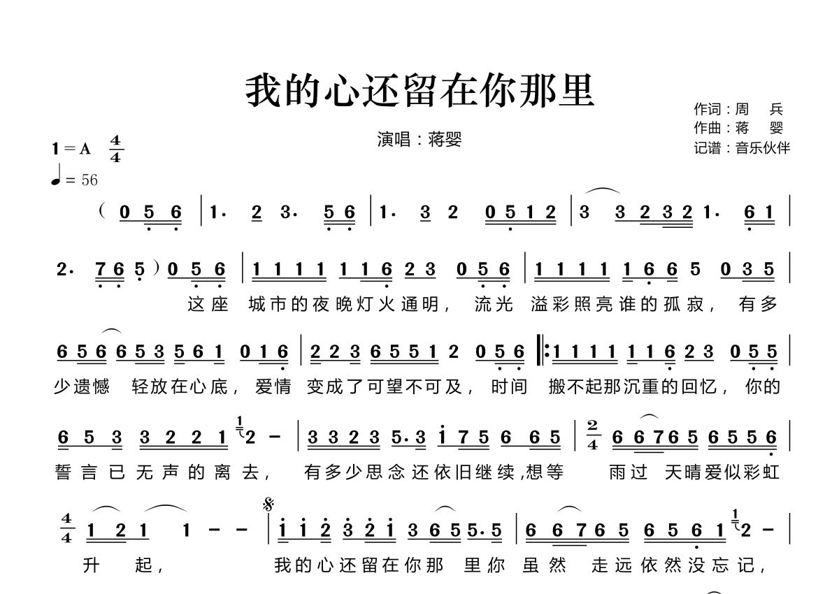 我的心还留在你那里简谱 - 蒋婴演唱