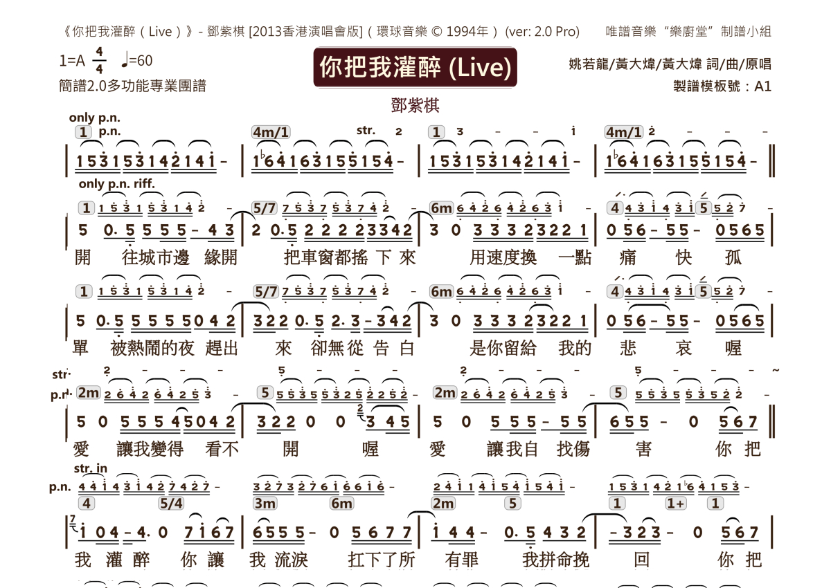 《你把我灌醉(Live)》是Live演唱的一首歌曲,2.0版多功能团谱,这份乐队总谱共有两张高清图谱,图谱由 @唯谱音乐"乐厨堂"发布小组 编配上传。