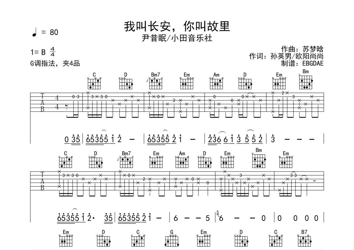 尹昔眠/小田音乐社《我叫长安,你叫故里》吉他谱 - G调弹唱六线谱