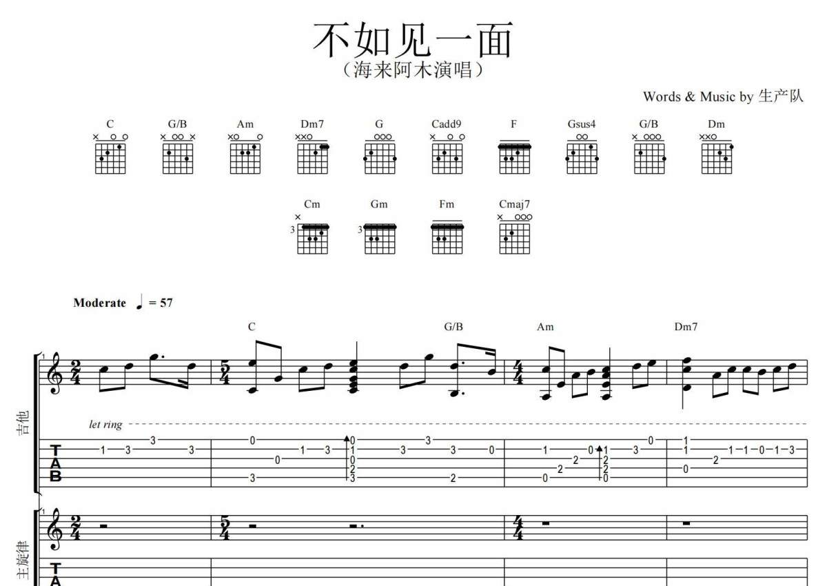 《不如见一面》是海来阿木演唱的一首歌曲,精编完美版,拍号为4/4拍,歌曲速度为每分钟57拍,歌曲原调为C调,本吉他谱采用的是C调指法编配,演奏时不需要使用变调夹即为原调,这份吉他谱共有六张高清图谱,图谱由 @生产队 编配上传,图谱使用六线谱编配,包含吉他和弦指法、简谱以及歌词部分,曲谱配备了相关的音频提供试听,使用这份不如见一面吉他谱,可以让你更加方便地掌握这首歌曲的弹唱技巧,快来尝试吧。海来阿木作词、作曲并演唱的经典歌曲《不如见一面》原版弹唱吉他谱,含精准的前奏、间奏、尾奏编配,精编完美版,怀旧经典!。