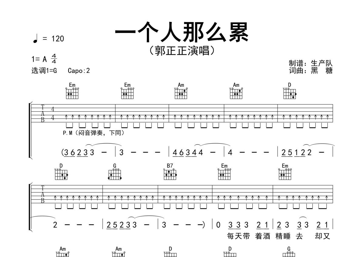 《一个人那么累》是郭正正演唱的一首歌曲,精编完美版,拍号为4/4拍,歌曲速度为每分钟120拍,歌曲原调为A调,但由于原调指法比较难,为了方便弹奏,本吉他谱采用的是G调指法编配,变调夹2品弹奏即为原调,当然也可以根据自己的音域改变变调夹位置,或者通过改变和弦调性,以方便自己弹奏,这份吉他谱共有三张高清图谱,图谱由 @生产队 编配上传,图谱使用六线谱编配,包含吉他和弦指法、简谱以及歌词部分,使用这份一个人那么累吉他谱,可以让你更加方便地掌握这首歌曲的弹唱技巧,快来尝试吧。郭正正演唱的歌曲《一个人那么累》原版吉他谱,含精准的前奏、间奏、尾奏solo编配,精编完美版,优质推荐!。