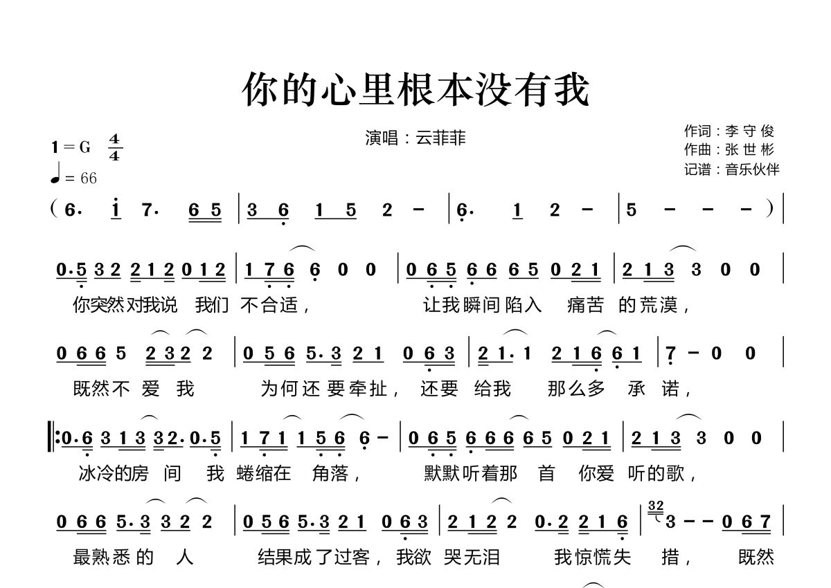 《你的心里根本没有我》是云菲菲演唱的一首歌曲,拍号为4/4拍,歌曲速度为每分钟66拍,这份简谱共有一张高清图谱,图谱由 @音乐伙伴 编配上传。