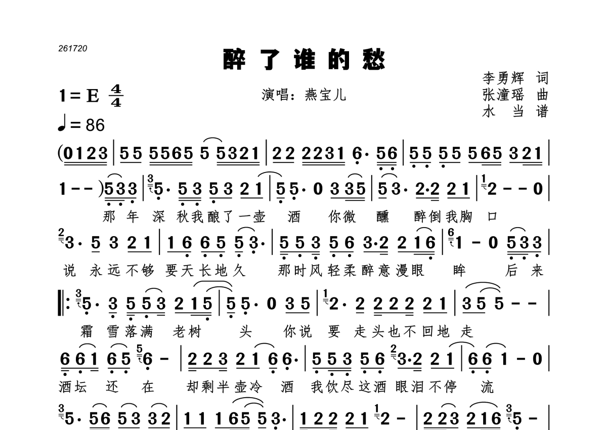 《醉了谁的愁》是燕宝儿演唱的一首歌曲,拍号为4/4拍,歌曲速度为每分钟86拍,这份简谱共有一张高清图谱,图谱由 @水当 编配上传。