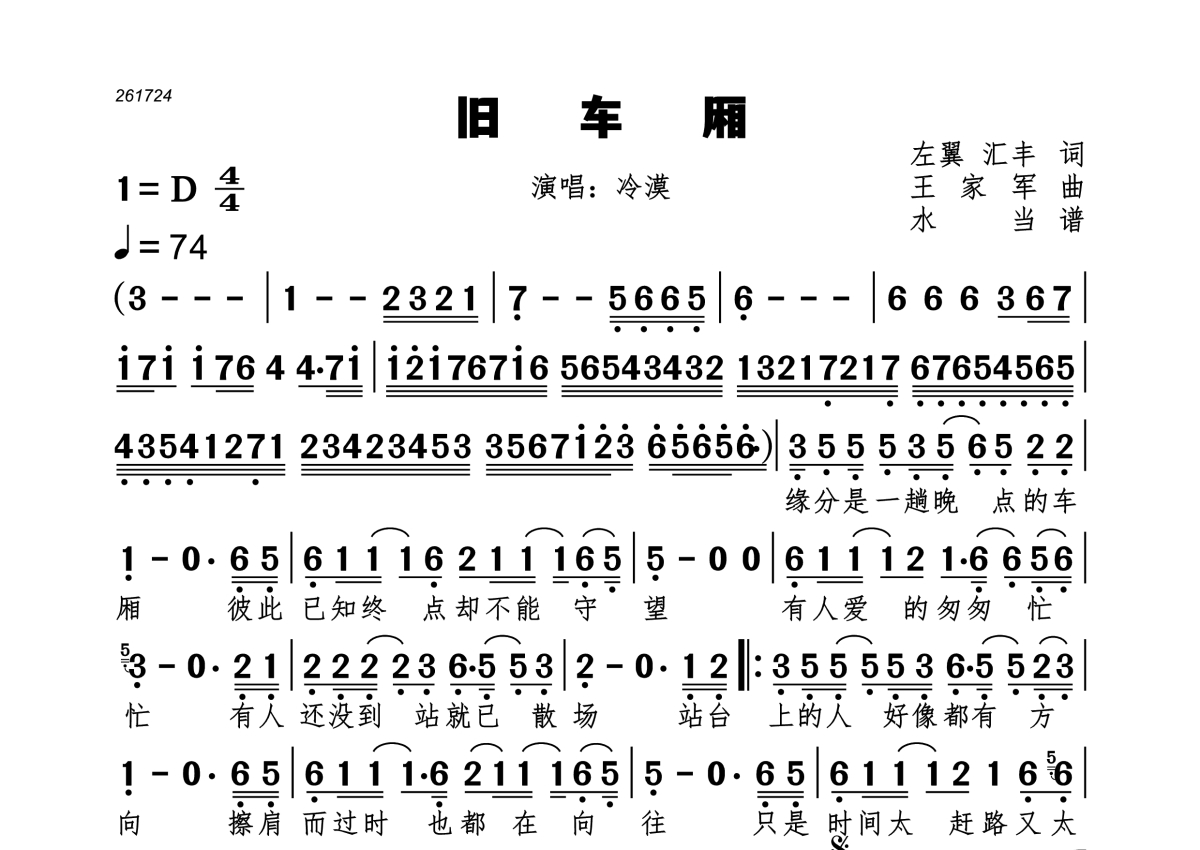 《旧车厢》是冷漠演唱的一首歌曲,拍号为4/4拍,歌曲速度为每分钟74拍,这份简谱共有一张高清图谱,图谱由 @水当 编配上传。