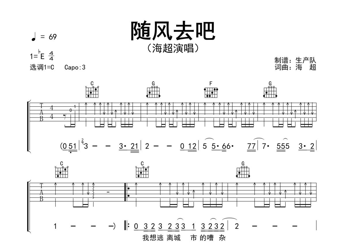 《随风去吧》是海超演唱的一首歌曲,精编完美版,拍号为4/4拍,歌曲速度为每分钟69拍,歌曲原调为Eb调,但由于原调指法比较难,为了方便弹奏,本吉他谱采用的是C调指法编配,变调夹3品弹奏即为原调,当然也可以根据自己的音域改变变调夹位置,或者通过改变和弦调性,以方便自己弹奏,这份吉他谱共有三张高清图谱,图谱由 @生产队 编配上传,图谱使用六线谱编配,包含吉他和弦指法、简谱以及歌词部分,使用这份随风去吧吉他谱,可以让你更加方便地掌握这首歌曲的弹唱技巧,快来尝试吧。海超作词、作曲并演唱的歌曲《随风去吧》原版吉他谱,含精准的前奏、间奏、尾奏solo编配,精编完美版,优质推荐!。