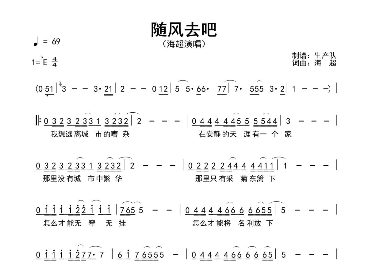 《随风去吧》是海超演唱的一首歌曲,原版简谱,拍号为4/4拍,歌曲速度为每分钟69拍,这份简谱共有一张高清图谱,图谱由 @生产队 编配上传海超作词、作曲并演唱的歌曲《随风去吧》原版简谱,含精准的前奏、间奏、尾奏solo编配,精编完美版,优质推荐!。