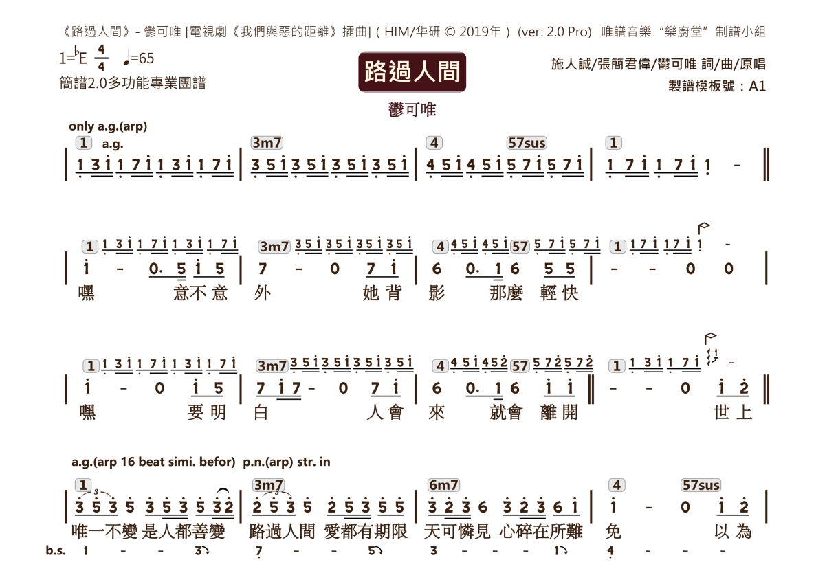 《路过人间》是郁可唯演唱的一首歌曲,2.0版多功能团谱,这份乐队总谱共有两张高清图谱,图谱由 @唯谱音乐"乐厨堂"发布小组 编配上传。
