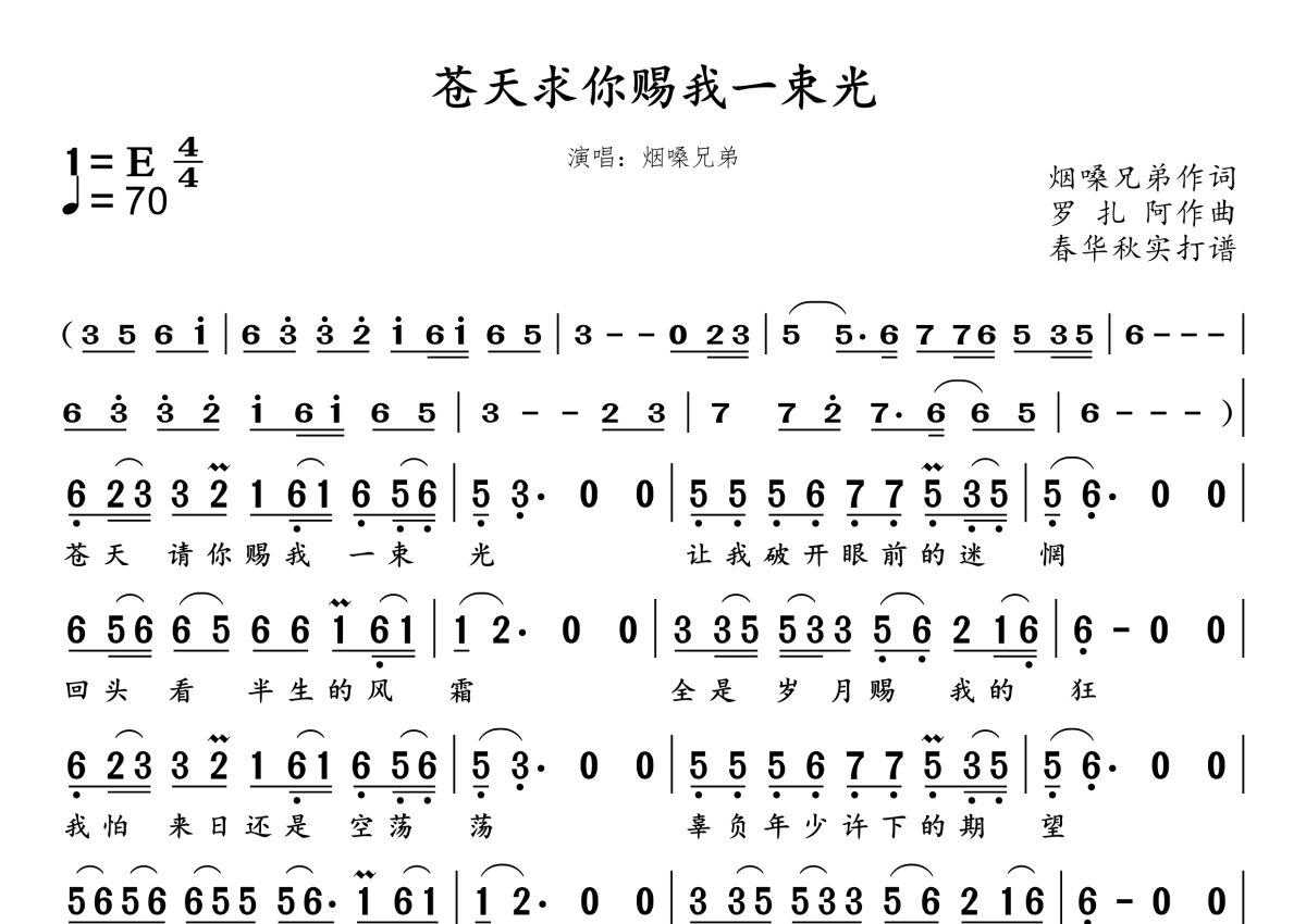 苍天求你赐我一束光简谱 - 烟嗓兄弟演唱