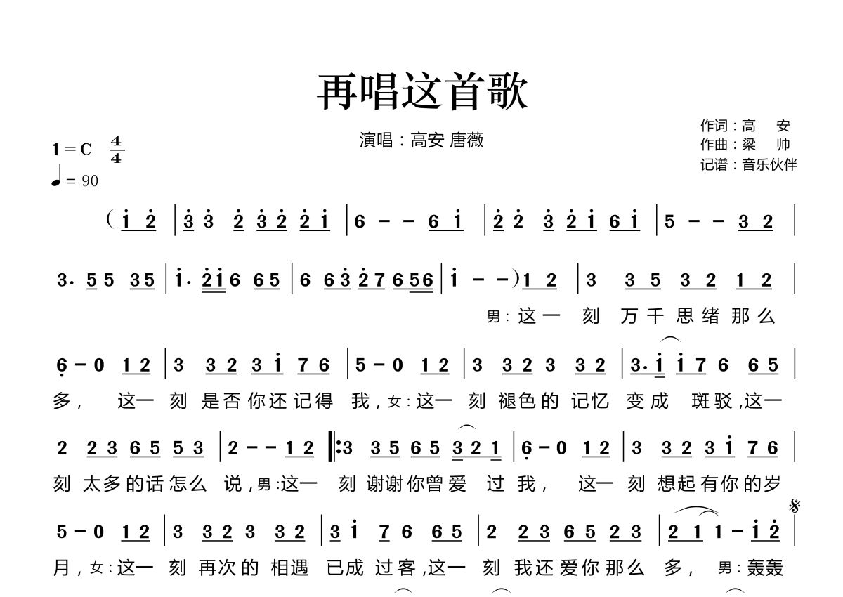 《再唱这首歌》是高安 唐薇演唱的一首歌曲,拍号为4/4拍,歌曲速度为每分钟90拍,这份简谱共有一张高清图谱,图谱由 @音乐伙伴 编配上传。