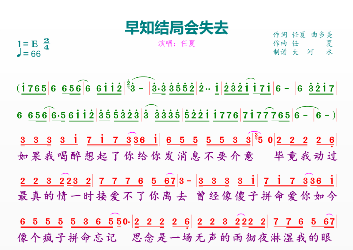早知结局会失去简谱 - 任夏演唱