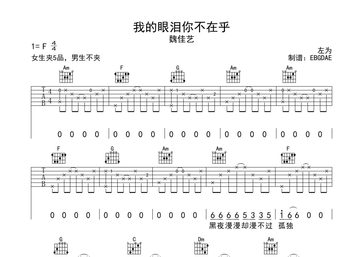 魏佳艺《我的眼泪你不在乎》吉他谱 - F调弹唱六线谱