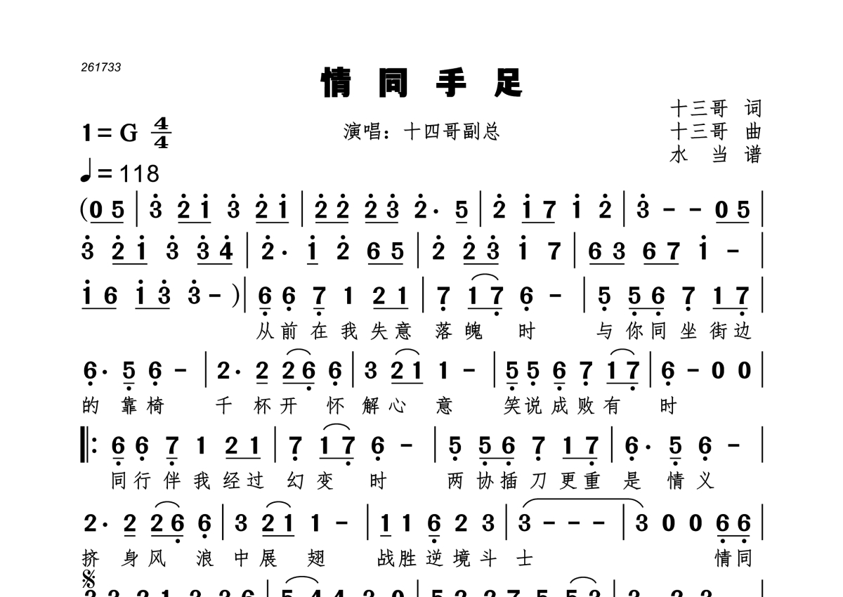 《情同手足》是十四哥副总演唱的一首歌曲,拍号为4/4拍,歌曲速度为每分钟116拍,这份简谱共有一张高清图谱,图谱由 @水当 编配上传。