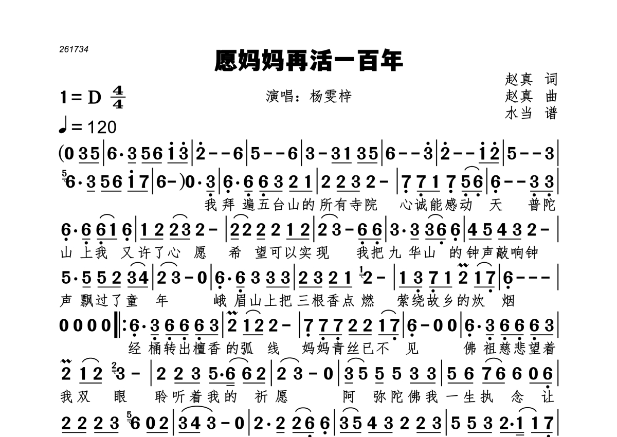 《愿妈妈再活一百年》是杨雯梓演唱的一首歌曲,拍号为4/4拍,歌曲速度为每分钟120拍,这份简谱共有一张高清图谱,图谱由 @水当 编配上传。