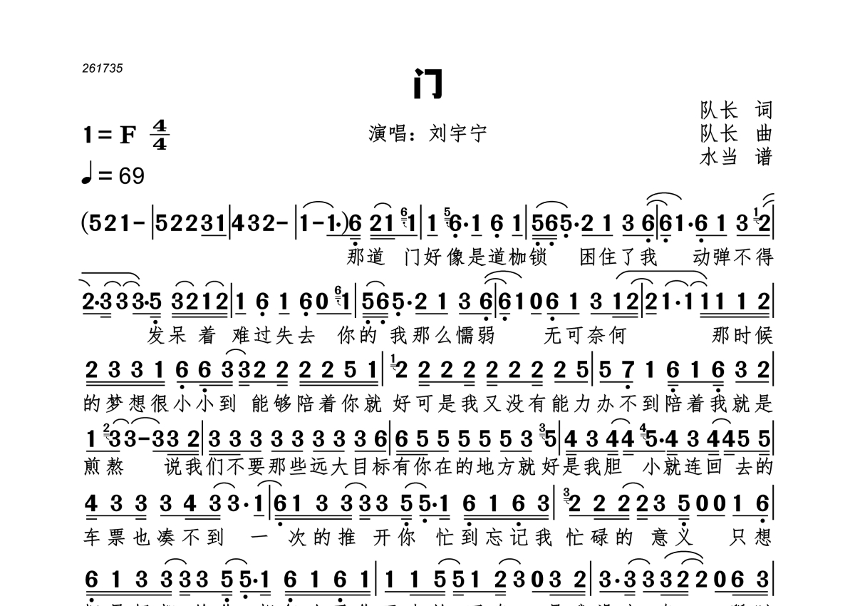 《门》是刘宇宁演唱的一首歌曲,拍号为4/4拍,歌曲速度为每分钟69拍,这份简谱共有一张高清图谱,图谱由 @水当 编配上传。