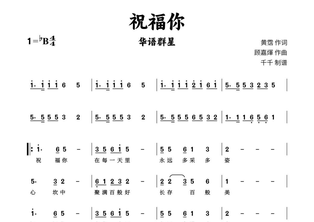 《祝福你》是华语群星演唱的一首歌曲,拍号为4/4拍,这份简谱共有两张高清图谱,图谱由 @千千 编配上传。