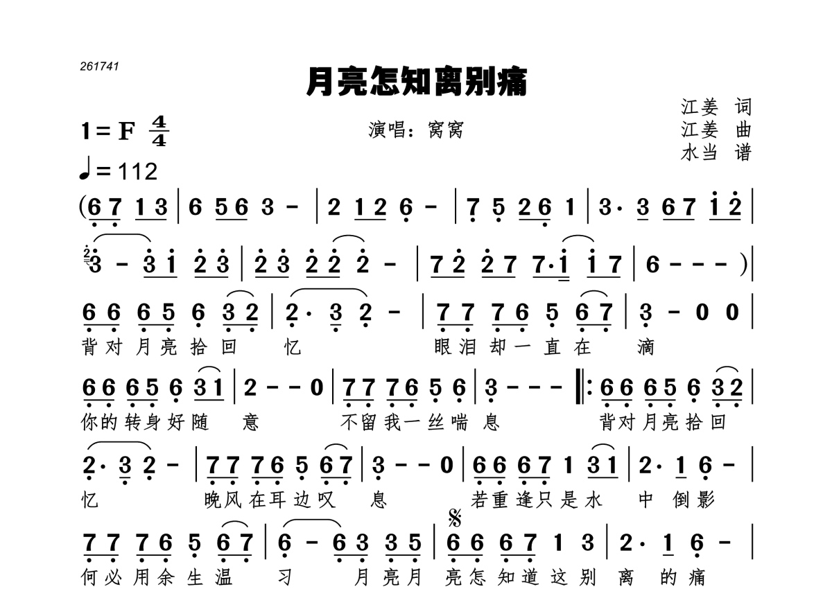 《月亮怎知离别痛》是窝窝演唱的一首歌曲,拍号为4/4拍,歌曲速度为每分钟112拍,这份简谱共有一张高清图谱,图谱由 @水当 编配上传。