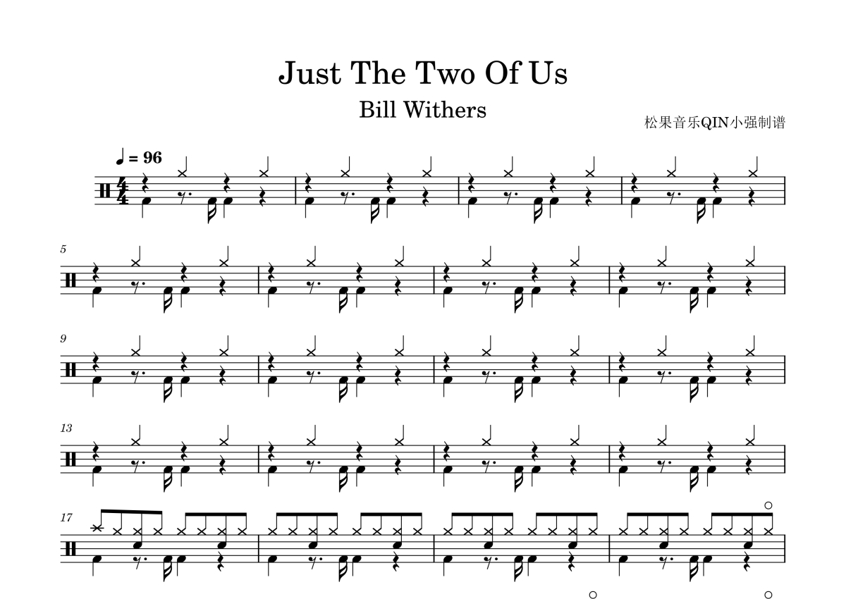 《Just The Two Of Us》是Bill Withers演唱的一首歌曲,拍号为4/4拍,这份架子鼓谱共有三张高清图谱,图谱由 @松果音乐QIN小强 编配上传,图谱使用五线谱编配,使用这份Just The Two Of Us架子鼓谱,你将能够轻松地敲打出这首Bill Withers的Just The Two Of Us,快来尝试吧。《JUST THE TWO OF US》是Bill Withers的著名作品之一,这是Withers与萨克斯手GROVER WASHINGTON, JR.在1980年合作的作品。 这首歌一经推出就因其优美的旋律、轻盈的节奏以及的清澈的曲风受到乐迷的欢迎,一直是电台、电视台、娱乐场所播放的经久不衰的作品,又因其亮丽的名字成为情侣之间传唱、点播、表达爱意的首选作品,甚至起到了千里姻缘一歌牵的作用。