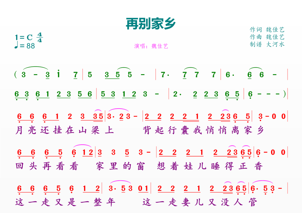 《再别家乡》是魏佳艺演唱的一首歌曲,拍号为4/4拍,歌曲速度为每分钟88拍,这份简谱共有一张高清图谱,图谱由 @临海雪原 编配上传。