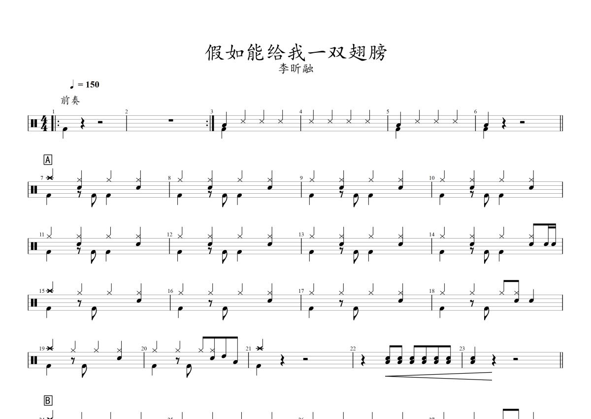 《假如能给我一双翅膀》是李昕融演唱的一首歌曲,拍号为4/4拍,歌曲速度为每分钟150拍,这份架子鼓谱共有三张高清图谱,图谱由 @音符喷血者 编配上传,图谱使用五线谱编配,使用这份假如能给我一双翅膀架子鼓谱,你将能够轻松地敲打出这首李昕融的假如能给我一双翅膀,快来尝试吧。