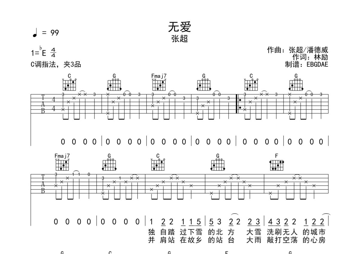 张超《无爱》吉他谱 - C调弹唱六线谱