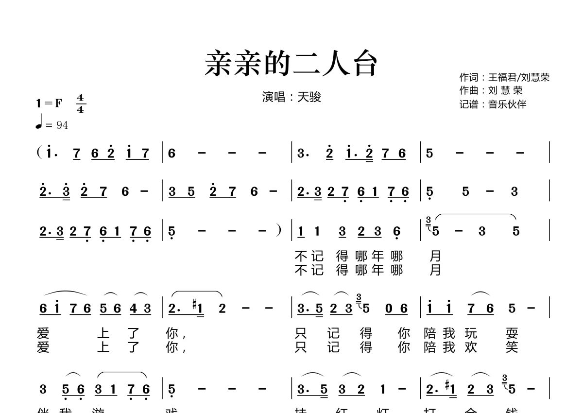 《亲亲的二人台》是天骏演唱的一首歌曲,拍号为4/4拍,歌曲速度为每分钟94拍,这份简谱共有两张高清图谱,图谱由 @音乐伙伴 编配上传。