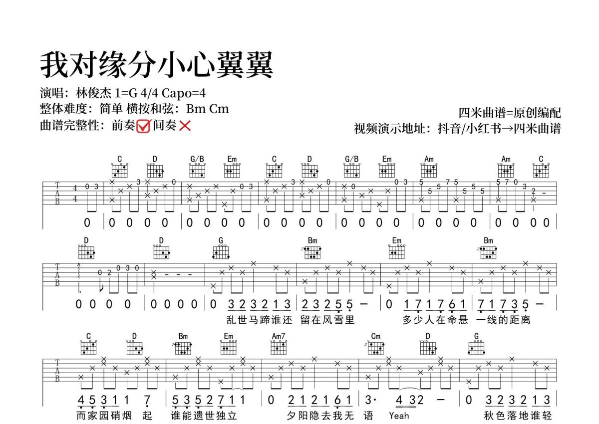 《我对缘分小心翼翼》是林俊杰演唱的一首歌曲,拍号为4/4拍,歌曲原调为B调,但由于原调指法比较难,为了方便弹奏,本吉他谱采用的是G调指法编配,变调夹4品弹奏即为原调,当然也可以根据自己的音域改变变调夹位置,或者通过改变和弦调性,以方便自己弹奏,这份吉他谱共有两张高清图谱,图谱由 @SRV7758521 编配上传,图谱使用六线谱编配,包含吉他和弦指法、简谱以及歌词部分,使用这份我对缘分小心翼翼吉他谱,可以让你更加方便地掌握这首歌曲的弹唱技巧,快来尝试吧。