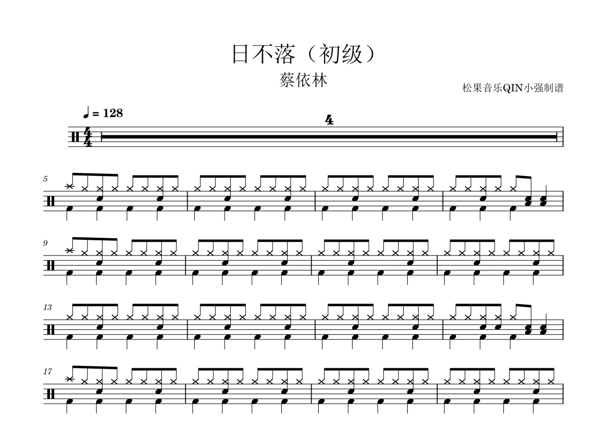 《日不落(初级)》是初级演唱的一首歌曲,拍号为4/4拍,这份架子鼓谱共有三张高清图谱,图谱由 @松果音乐QIN小强 编配上传,图谱使用五线谱编配,使用这份日不落(初级)架子鼓谱,你将能够轻松地敲打出这首初级的日不落(初级),快来尝试吧。《日不落》是蔡依林演唱的流行舞曲,改编自瑞典三人电子音乐组合空壳乐队(BWO)创作并发表于2005年的英文歌曲《Sunshine In The Rain》,由崔惟楷重新填词,空壳乐队作曲,林迈可编曲。该曲收录于蔡依林推出的个人第九张音乐专辑《特务J》,于2007年9月21日通过百代唱片(EMI)随专辑正式发行。