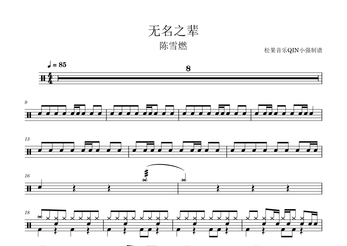 《无名之辈》是陈雪燃演唱的一首歌曲,拍号为4/4拍,这份架子鼓谱共有两张高清图谱,图谱由 @松果音乐QIN小强 编配上传,图谱使用五线谱编配,使用这份无名之辈架子鼓谱,你将能够轻松地敲打出这首陈雪燃的无名之辈,快来尝试吧。《无名之辈》是由唐汉霄作词、作曲,陈雪燃演唱的一首歌曲,收录于2019年7月19日发行的影视原声带《亲爱的,热爱的》中。这首歌通过摇滚激昂的曲风和直白的歌词,表达了普通人在追求梦想过程中的坚持与努力,反映了剧中角色的心声和情感。