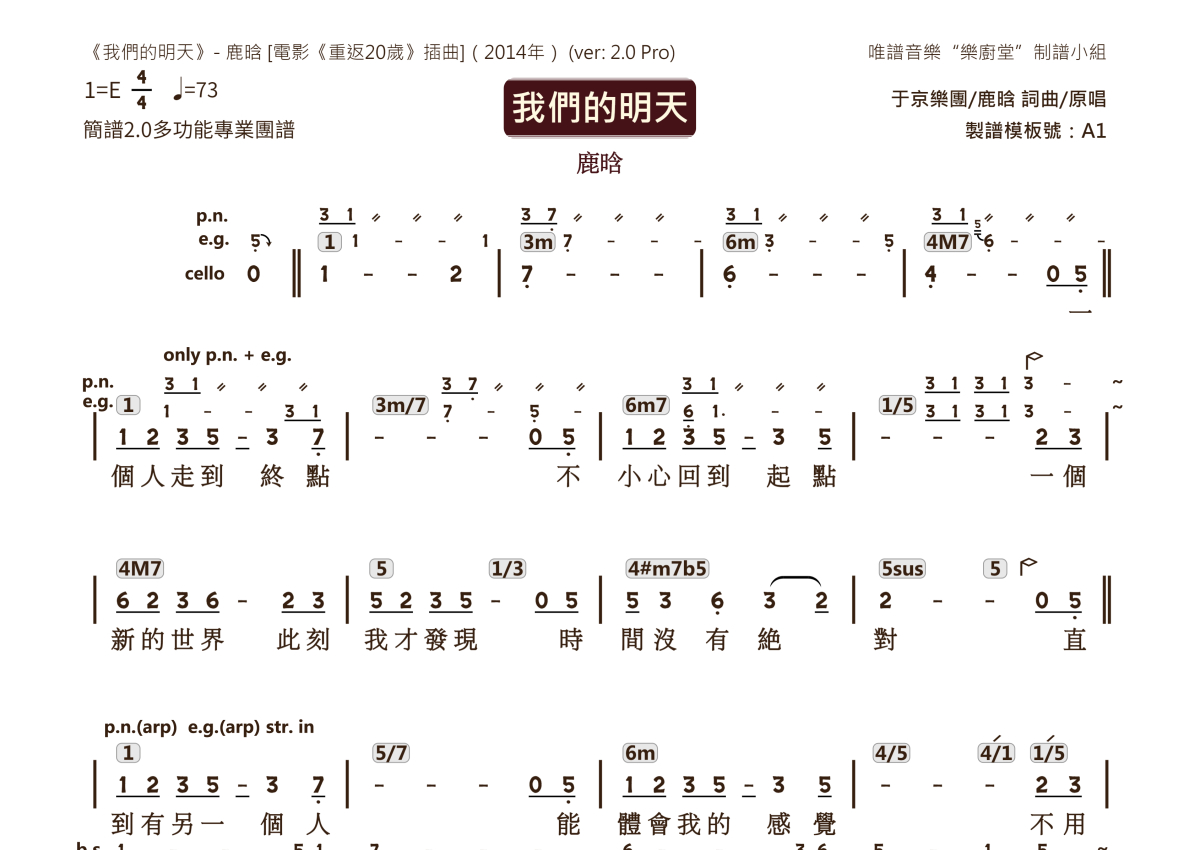 “乐厨堂”乐谱发布小组: 出版级乐谱扒谱制谱——以职业乐手圈通行标准记谱,遵循原版和声、伴奏元素和段落结构。 ❶ 2.0多功能专业团谱:采用台湾卓著公司开创的二代简谱标准制作。二代简谱无疑是迄今为止最科学、最易读的专业范畴多功能记谱方案:❷ 框架谱:采用职业乐手通常记谱方案制作。