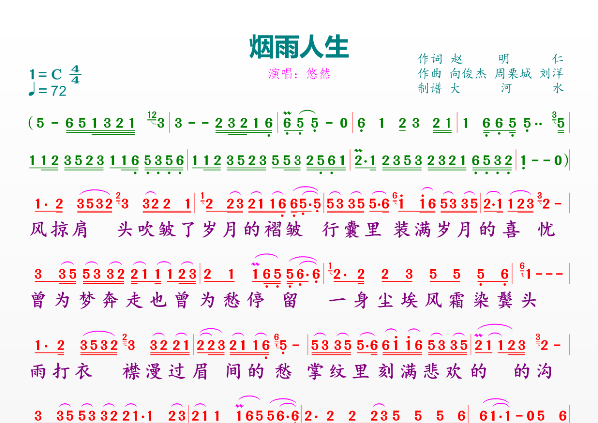 《烟雨人生》是悠然演唱的一首歌曲,拍号为4/4拍,歌曲速度为每分钟72拍,这份简谱共有一张高清图谱,图谱由 @临海雪原 编配上传。
