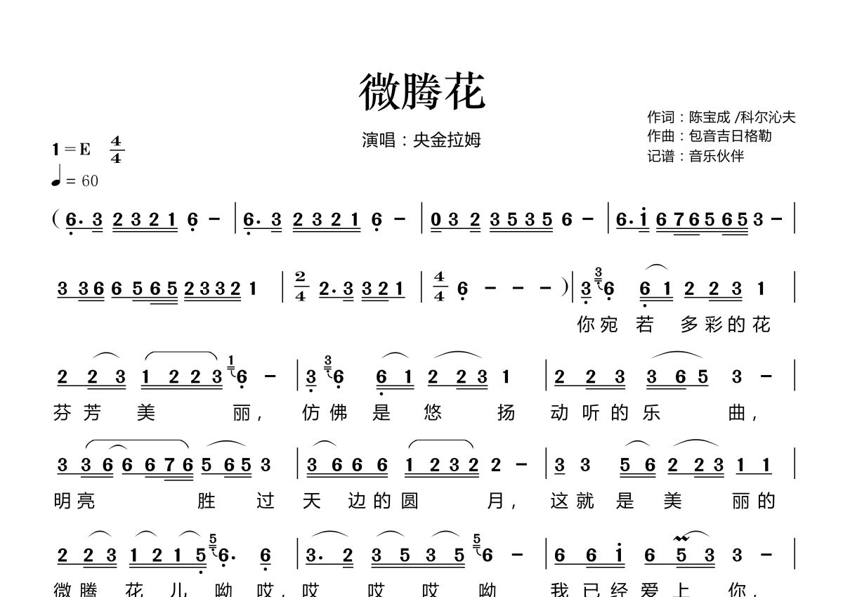 《微腾花》是央金拉姆演唱的一首歌曲,拍号为4/4拍,歌曲速度为每分钟60拍,这份简谱共有两张高清图谱,图谱由 @音乐伙伴 编配上传。