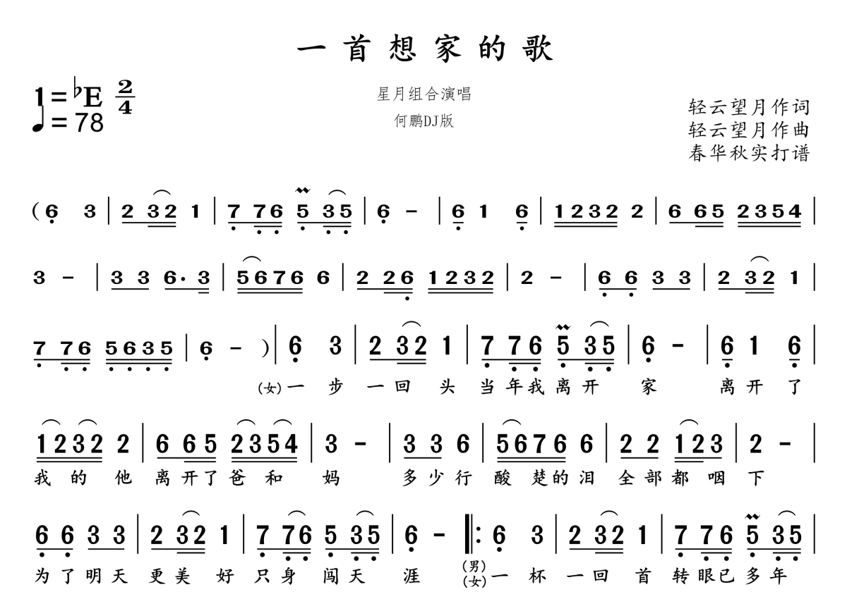 一首想家的歌(DJ版)简谱 - 星月组合演唱