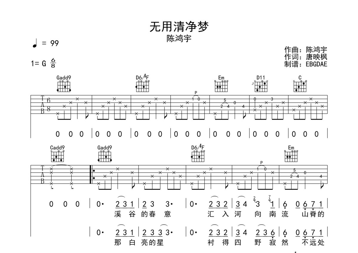 《无用清净梦》是陈鸿宇演唱的一首歌曲,本吉他谱采用的是G调指法编配,这份吉他谱共有三张高清图谱,图谱由 @EBGDAE 编配上传,图谱使用六线谱编配,包含吉他和弦指法、简谱以及歌词部分,使用这份无用清净梦吉他谱,可以让你更加方便地掌握这首歌曲的弹唱技巧,快来尝试吧。原版编配,物美价廉,放心选购!加油!。