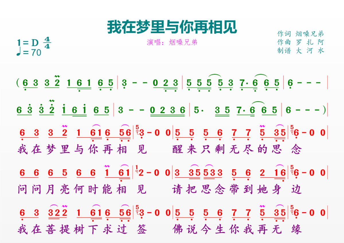 《我在梦里与你再相见》是烟嗓兄弟演唱的一首歌曲,拍号为4/4拍,歌曲速度为每分钟70拍,这份简谱共有一张高清图谱,图谱由 @临海雪原 编配上传。