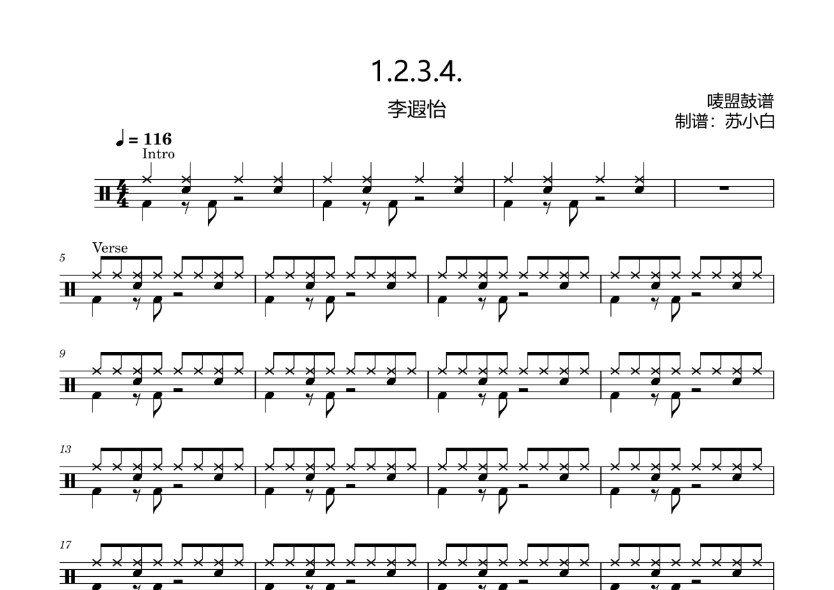 《1.2.3.4》是李遐怡演唱的一首歌曲,简单版,这份架子鼓谱共有三张高清图谱,图谱由 @苏小白 编配上传,图谱使用五线谱编配,使用这份1.2.3.4架子鼓谱,你将能够轻松地敲打出这首李遐怡的1.2.3.4,快来尝试吧。《1.2.3.4》李遐怡,高清鼓谱,适合新手练习的曲目, 节奏感强,鼓点清晰。
