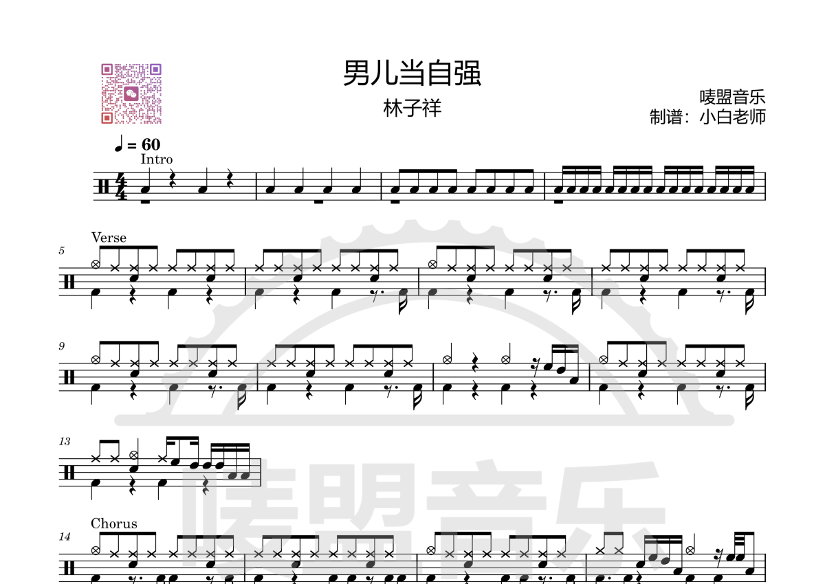 《男儿当自强》是林子祥演唱的一首歌曲,拍号为4/4拍,歌曲速度为每分钟60拍,这份架子鼓谱共有两张高清图谱,图谱由 @苏小白 编配上传,图谱使用五线谱编配,使用这份男儿当自强架子鼓谱,你将能够轻松地敲打出这首林子祥的男儿当自强,快来尝试吧。