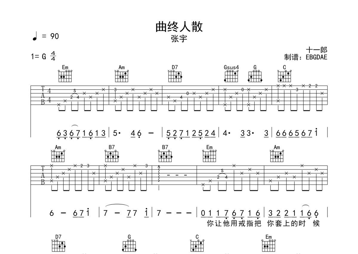 张宇《曲终人散》吉他谱 - G调弹唱六线谱