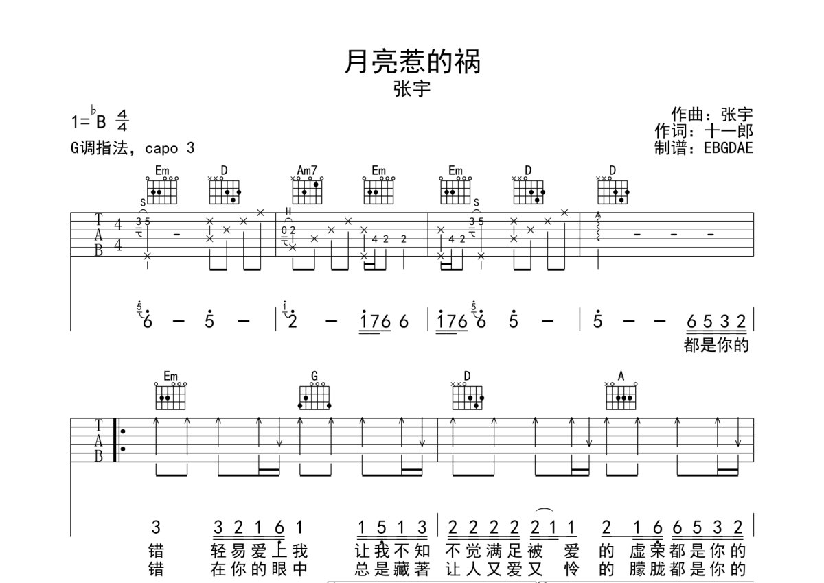 张宇《月亮惹的祸》吉他谱 - G调弹唱六线谱